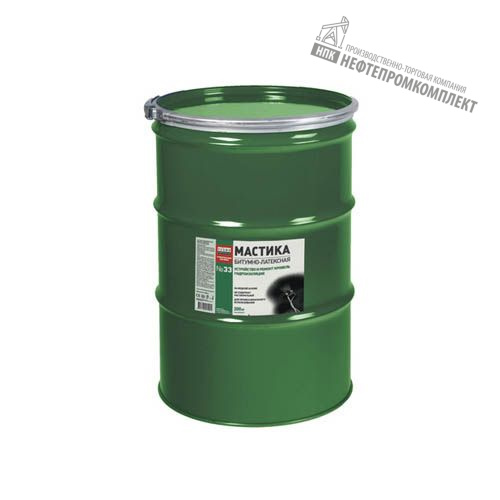 Мастика битумная Технониколь 33 — 2-компонентный материал, улучшенный латексом и полимерными добавками. Не содержит растворителей органического происхождения. Первый (основной) компонент — дисперсная система из взаимно нерастворимых битума и воды. Цвет — темно-коричневый. Поставляется в бочках по 200 л, транспортируется крытым транспортом. Вторая составляющая — двуводный хлорид кальция, который разводится в воде. Выпускается в виде гранул в банках весом по 2 кг.